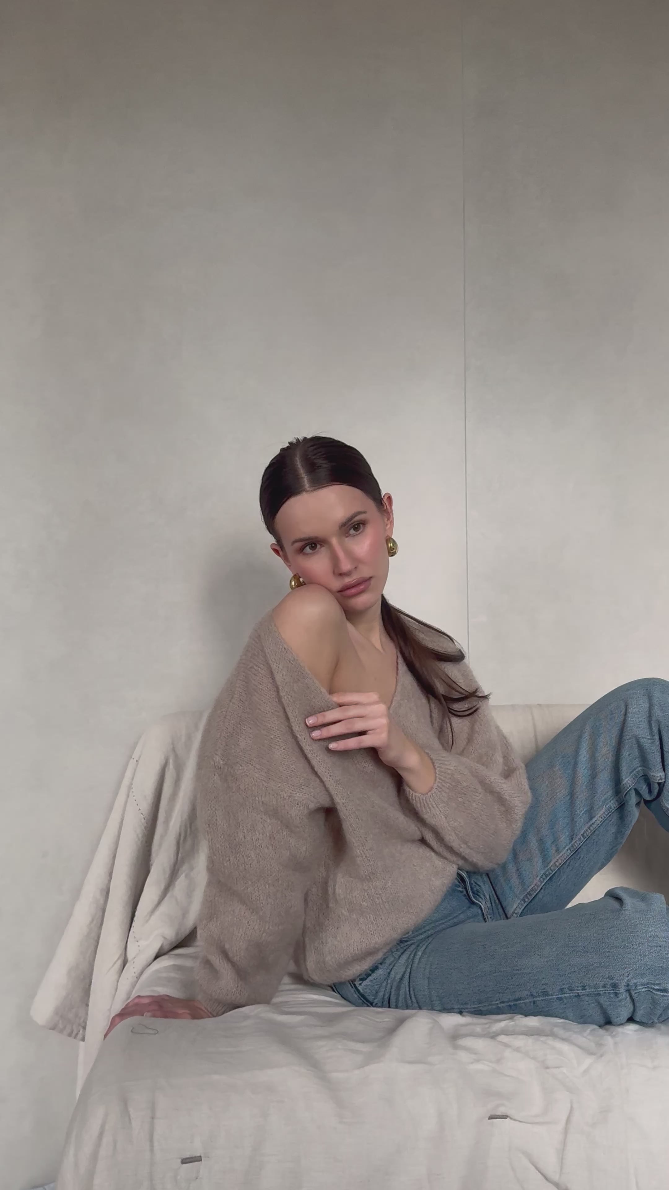 Ten beżowy sweter damski w serek to kwintesencja ponadczasowego stylu i wyjątkowego komfortu. Wykonany w 76% z kid moheru, wyróżnia się niezwykłą lekkością, miękkością i przyjemnym otuleniem skóry. To idealna propozycja dla osób ceniących jakość i luksusowe materiały. Świetnie prezentuje się w połączeniu z eleganckimi dołami, takimi jak szerokie spodnie palazzo z satyny wiskozowej Cara – ich zwiewny, delikatnie połyskujący materiał doda stylizacji lekkości i elegancji.