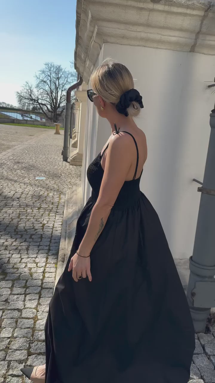 Lekka, przewiewna, kobieca – ta długa czarna sukienka została stworzona z myślą o letnich dniach, w których chcesz czuć się swobodnie, ale wyglądać stylowo. Uszyta w 100% z wysokogatunkowej bawełny i wykończona delikatną podszewką z tkaniny o takim samym składzie, zapewnia komfort noszenia nawet w największe upały.