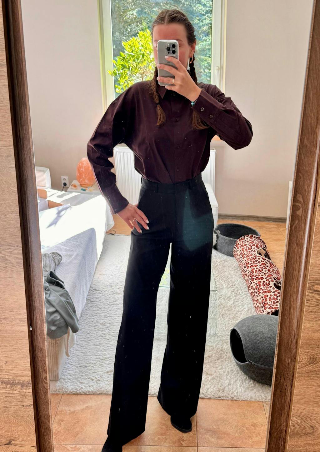 Dzięki przemyślanemu fasonowi, te spodnie z wełny doskonale przylegają do sylwetki, jednocześnie nie krępując ruchów. Średni stan zapewnia wygodę noszenia, a zapięcie na zamek z przodu dodaje klasycznego, eleganckiego wykończenia. Tkanina jest lekko elastyczna, przewiewna, dzięki czemu czujesz się w nich niezwykle komfortowo cały dzień. Świetnym dopełnieniem tej stylizacji jest czarne body z golfem z wiskozy i modalu – to wyjątkowo komfortowa baza, która nadaje całości subtelnie zmysłowego akcentu.