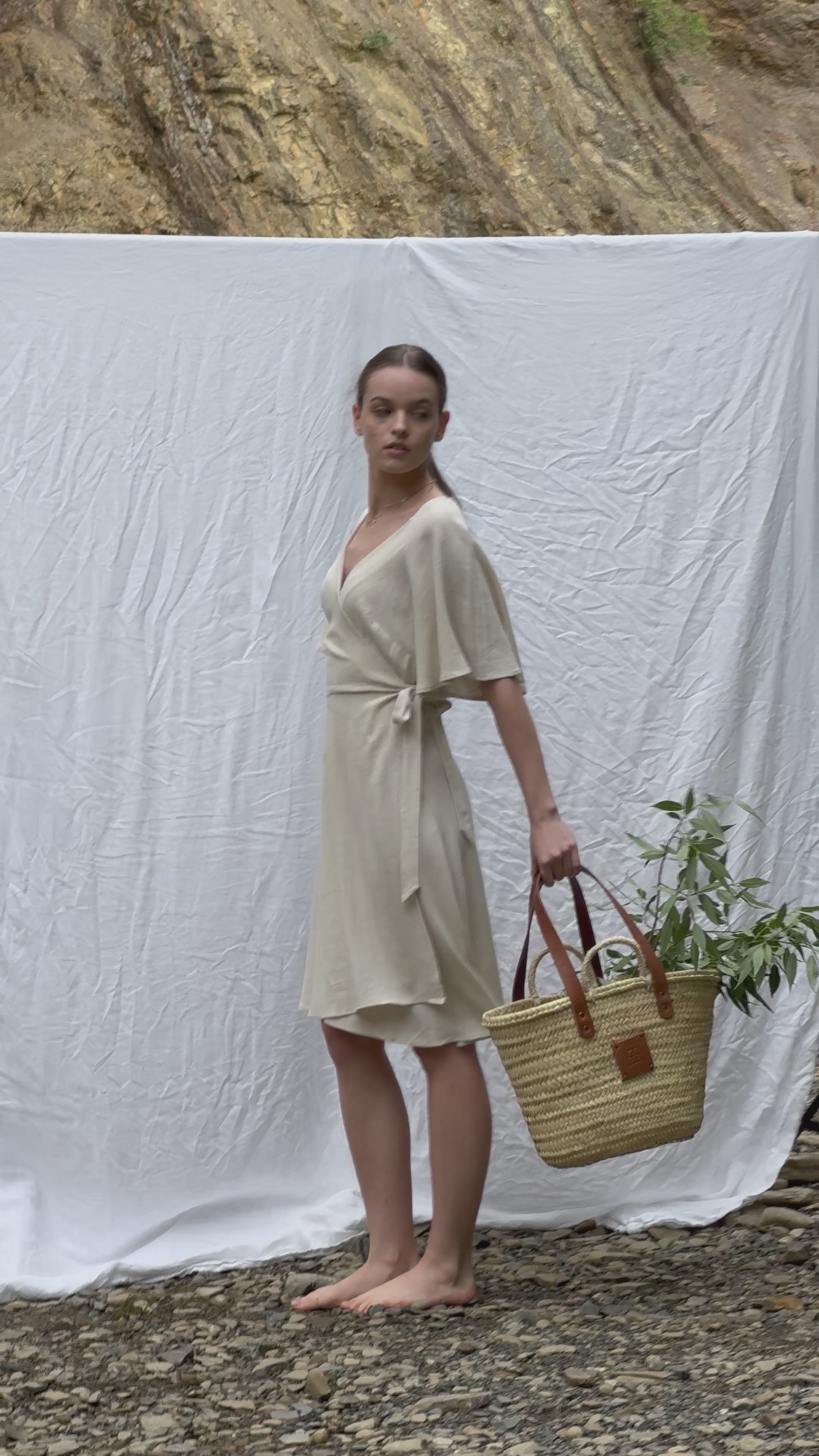 Sukienka kopertowa z wiązaniem w kolorze naturalnego beżu.