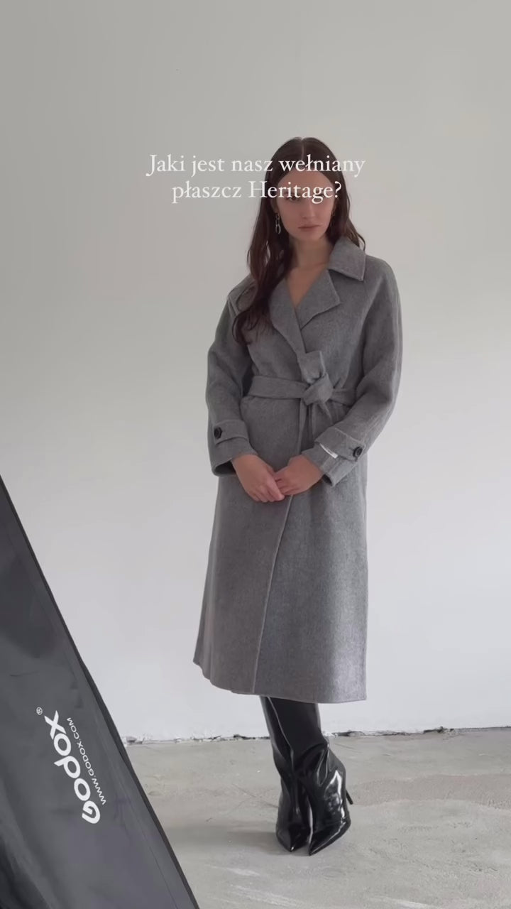 Dwurzędowy wełniany trencz damski szary - HERITAGE